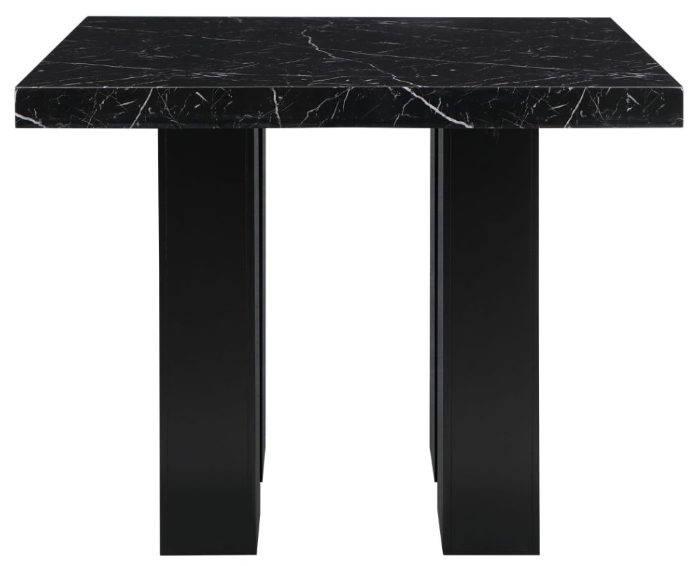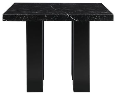 Black Faux marble counter table design with an extra thick top and a double pedestal base with silver connectors. sleek metal legs, and comfortable design make it a stylish and inviting choice for a contemporary bar or counter.Read More