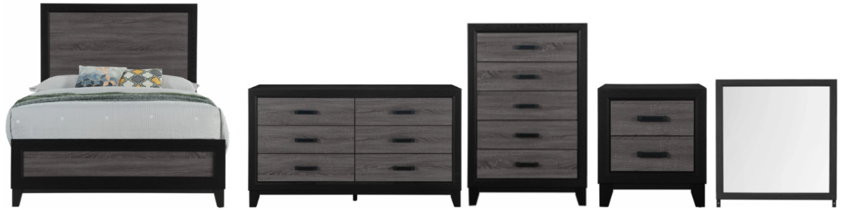 Set includes full bed, nightstand, mirror, dresser, chest