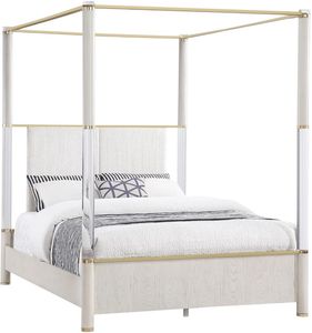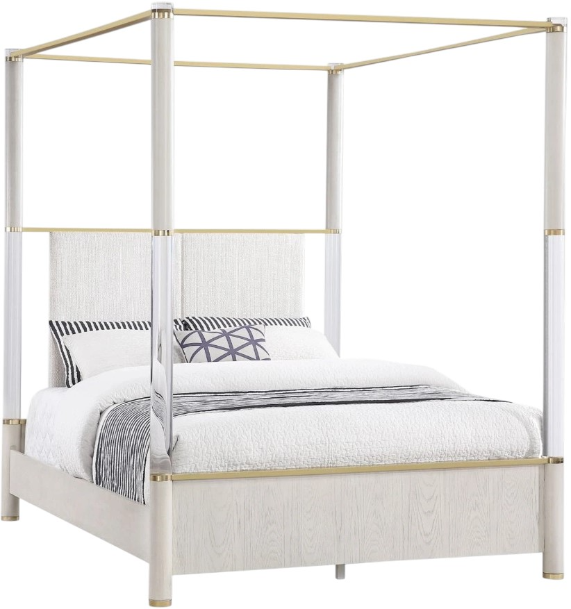 The Malmo Queen Canopy Bed is a stunning statement of modern luxury. Framed in a light beige oak veneer, it features acrylic posts accented with gold trim for a glamorous touch. The beige textured upholstered headboard adds softness and elegance, while matching gold accents on the canopy, headboard, and footboard complete the upscale look.Read More
