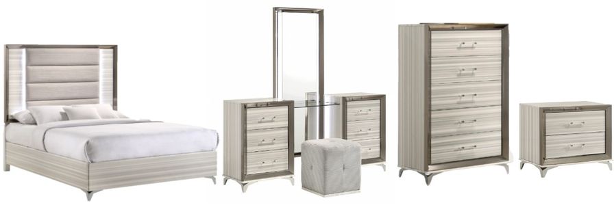 This set includes bed, nightstand, chest, floor length mirror with LED, two (2) vanity dresser and stool